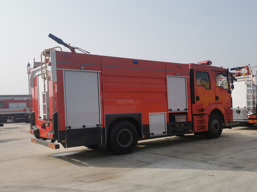 豪沃8噸水罐消防車采用重汽豪沃ZZ5207TXFV471GF5底盤改裝而成。整車由消防員乘員室和車身兩大部分組成,乘員室為原裝雙排,可乘坐2+4人,該車為外露罐結構,車身前部為器材箱,中部為罐體,后部為泵房。載液罐體為優質碳鋼,內部噴涂環氧底漆及環氧瀝青漆,與底盤采用彈性連接,載水量7900kg,裝備了上海茸申消防設備有限公司生產CB10/60型消防泵,額定流量60L/S,車頂安裝成都威斯特消防機械有限公司生產的PS8/60W型車用消防炮。該車最大的特點是載液量大、操控性好、維修簡便。可廣泛應用于公安消防隊、廠礦企業及社區、碼頭等場所,撲救大型油類火災和一般物質火災。 | |||