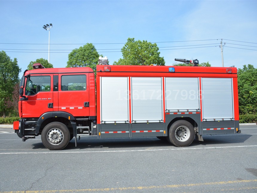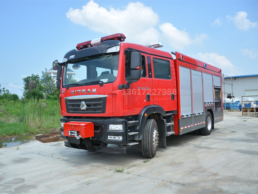 汕德卡壓縮空氣泡沫消防車采用中國重汽集團濟南商用車有限公司生產的汕德卡ZZ5206N471GF5(國六)消防車底盤改裝而成。整車由消防員乘員室和車身兩大部分組成,乘員室為原裝雙排駕駛室,可乘坐2+4人,該車為內藏罐結構,車身前部為器材箱,中部為水罐,水罐兩側為器材箱,后部為泵房。載液罐體為304不銹鋼,與底盤采用彈性連接,載水4500L,泡沫液量1000 L(A,B類各500L),裝備了茸申CB10/60-RS消防泵,德川模塊式DC-CAFS60/45M壓縮空氣泡沫滅火系統,廣泛應用于地下、石油、化工、大型商場、高層住宅、重點文物、車站碼頭等。特別節省水和泡沫液,高效環保,而且不會造成二次傷害。