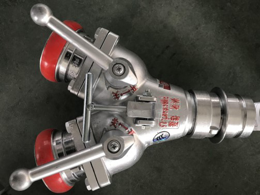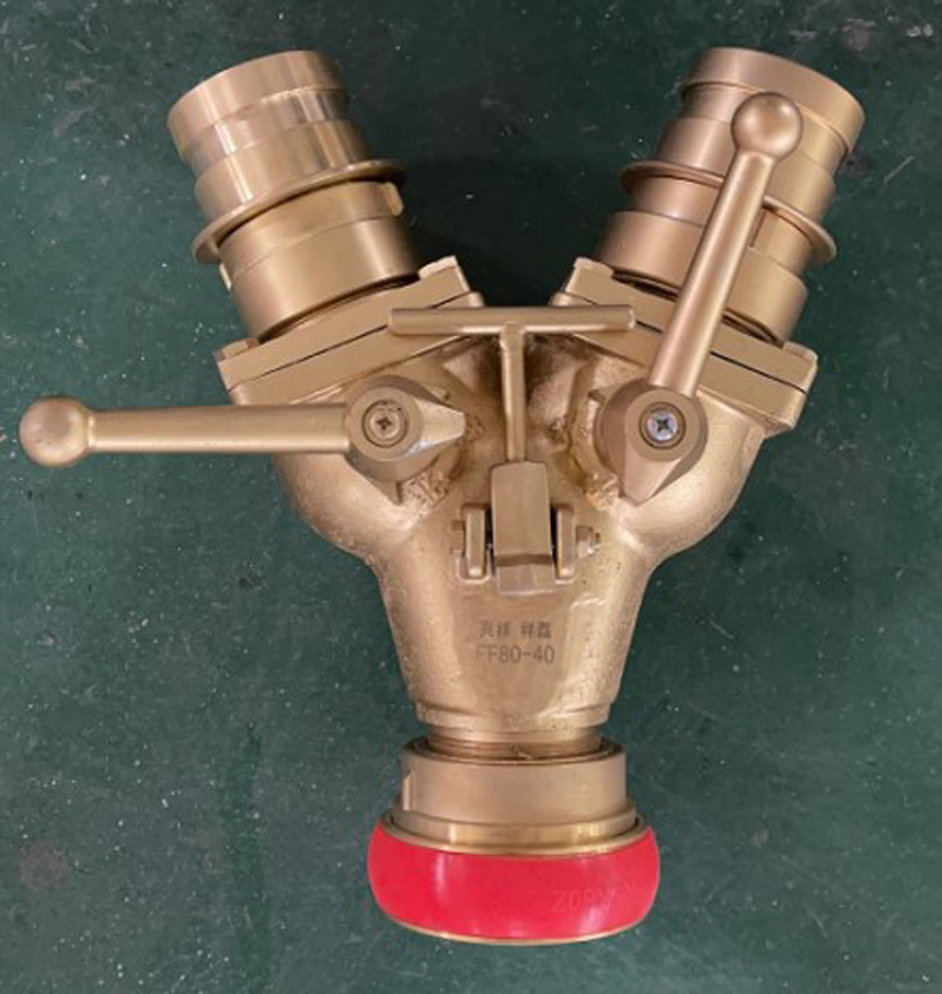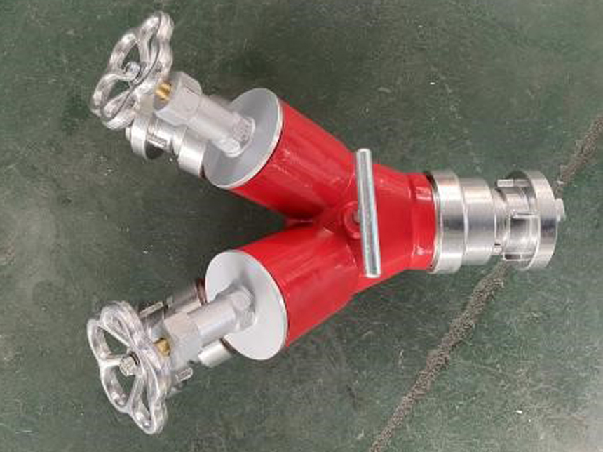 二分水是從水帶主干線分出水帶分線的器材。采用鋁合金經精加工而成,由主體、閥體、接口組成,每一個分水器有一個進水口和幾個出水口,出水口上均有球閥裝置,可以同時使用,也可以分別使用,便于控制水流水壓,增加和調換支線水帶。